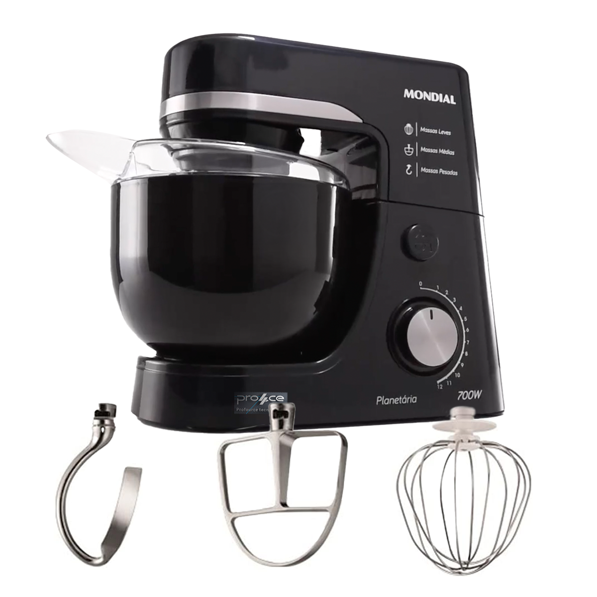 - Itens inclusos: 01 Batedeira Planetária; 01 Batedor de Massas Leves; 01 Batedor de Massas Médias; 01 Batedor de Massas Pesadas e 01 Manual de instruções