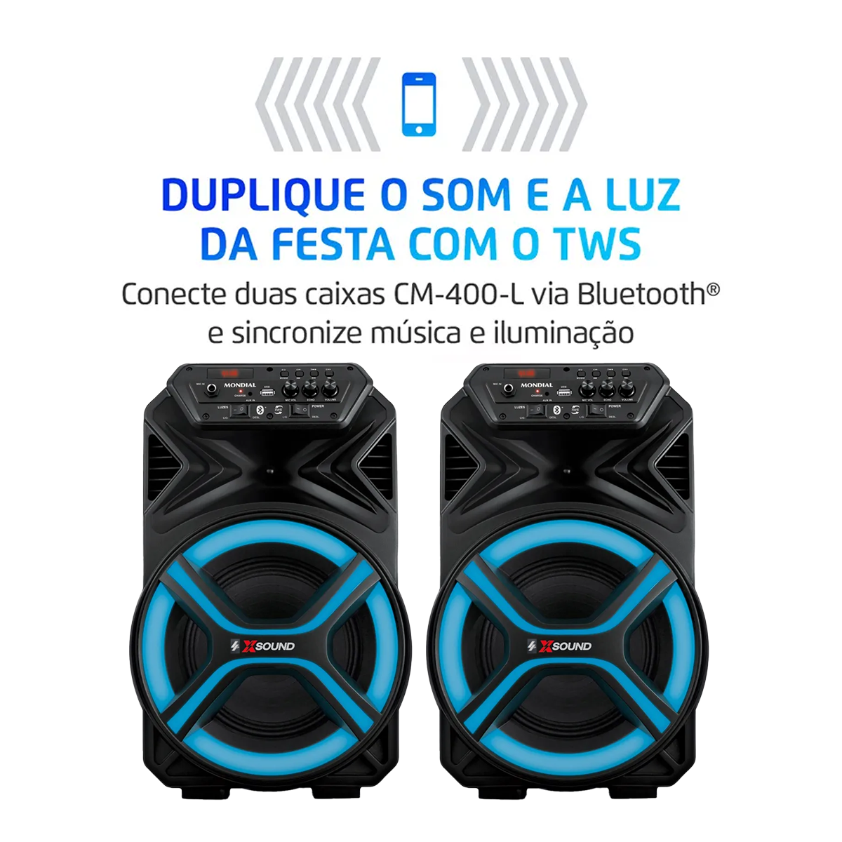 A Caixa Amplificada Mondial CM-400-L é perfeita para quem quer levar a festa para qualquer lugar! Compacta, potente e com 400W RMS, ela oferece um som envolvente com graves intensos e agudos nítidos graças ao sistema de 2 vias, woofer de 8” e tweeter de 1,5”. Com iluminação LED Color Lights, a CM-400-L transforma qualquer ambiente em uma pista de dança, sincronizando luzes e música para animar todos os momentos.
