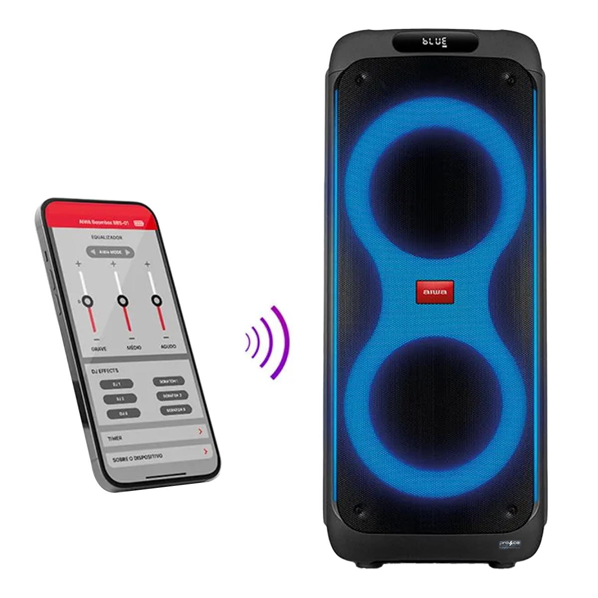 Muito mais que potência, a AWS-PB-04 oferece praticidade e interatividade. Pelo aplicativo AIWA Brasil, você pode controlar funções direto do celular, além de aproveitar múltiplas conexões para microfones e instrumentos, ideal para karaokê ou uma jam session com os amigos. Com Bluetooth 5.3, função TWS para duplicar o som ao parear duas caixas, a PartyBox AIWA é a parceira ideal para levar música, cor e energia aonde quer que você vá.