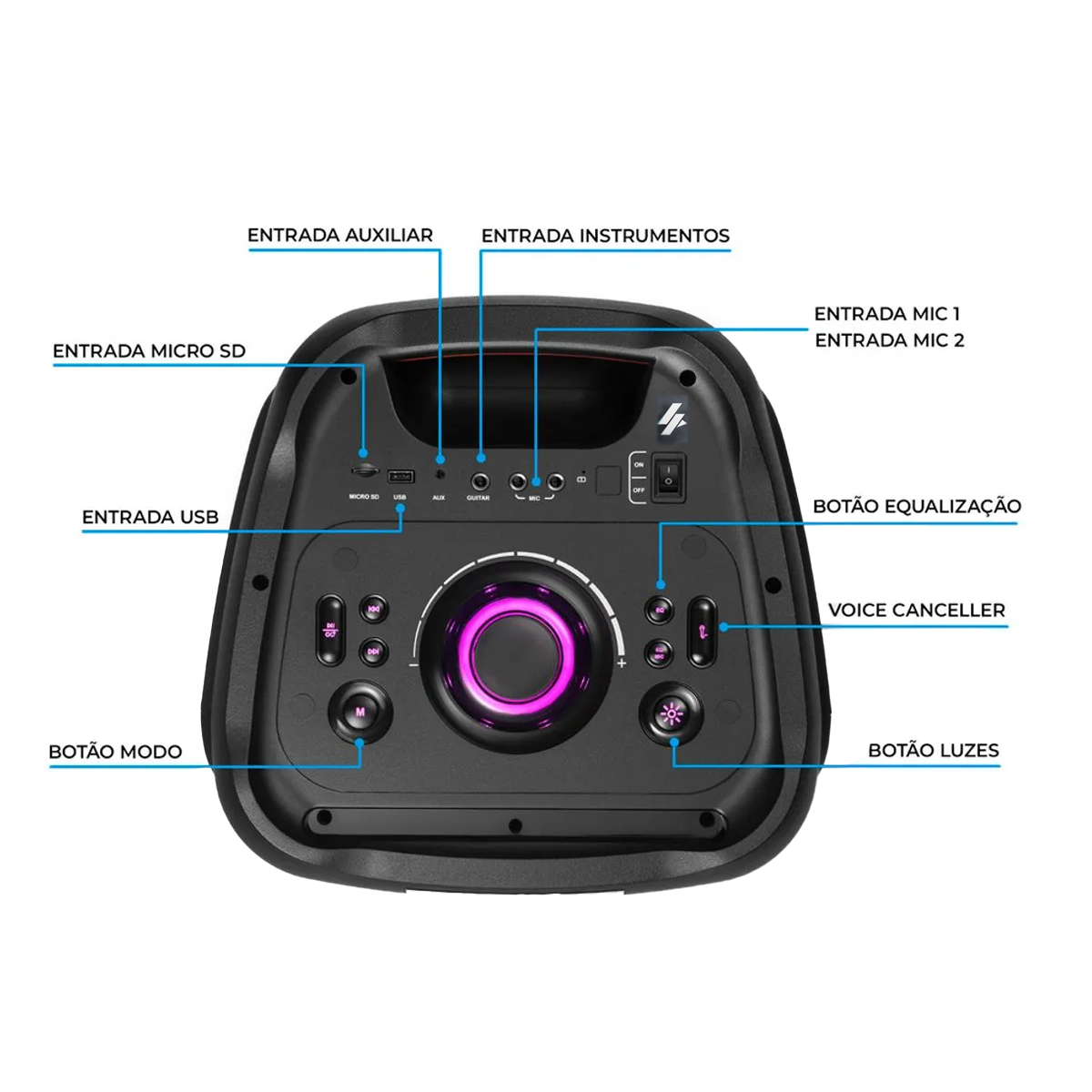 - Entradas: 1- USB | 1- Auxiliar.in (P2) | 1- Guitar.in (P10)| 2 – Microfone.in (P10) | 1 - Micro SD