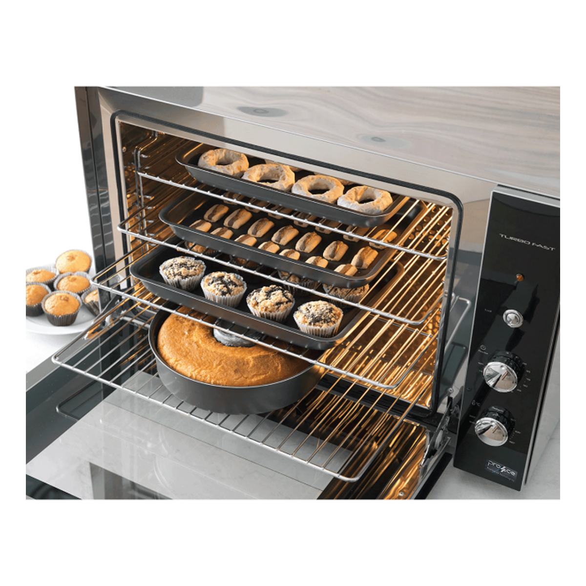 Com a função Air Convection Turbo, o ar quente circula de forma uniforme por toda a cavidade do forno, garantindo assados por igual, gratinados no ponto certo e aquecimento rápido. Esse sistema também evita a mistura de aromas e sabores, permitindo preparar diferentes receitas ao mesmo tempo. O modelo conta ainda com painel analógico com timer de até 120 minutos e termostato ajustável até 320 °C, oferecendo maior controle durante o preparo, além de porta com vidro duplo, que aumenta a segurança e ajuda a manter a temperatura interna com mais eficiência energética.