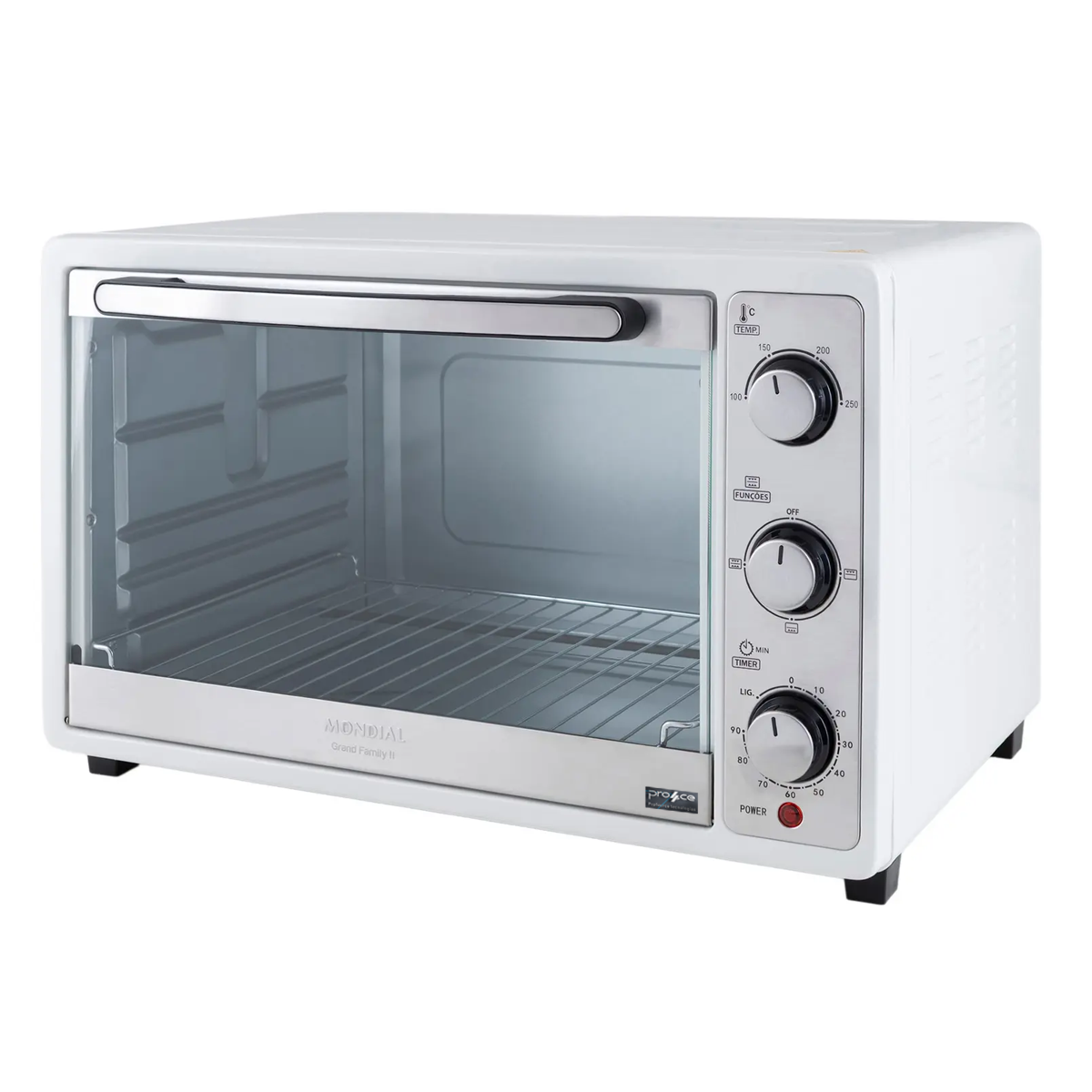 Com design moderno e acabamento em aço inox, o FRN-52-W alia estilo e durabilidade. Sua porta de vidro permite acompanhar o preparo dos alimentos em tempo real, enquanto a grelha ajustável em três níveis proporciona mais versatilidade para diferentes tipos de cozimento. Completo e funcional, o Forno Elétrico Mondial Grand Family II é o aliado perfeito para quem deseja praticidade e alto desempenho na cozinha.