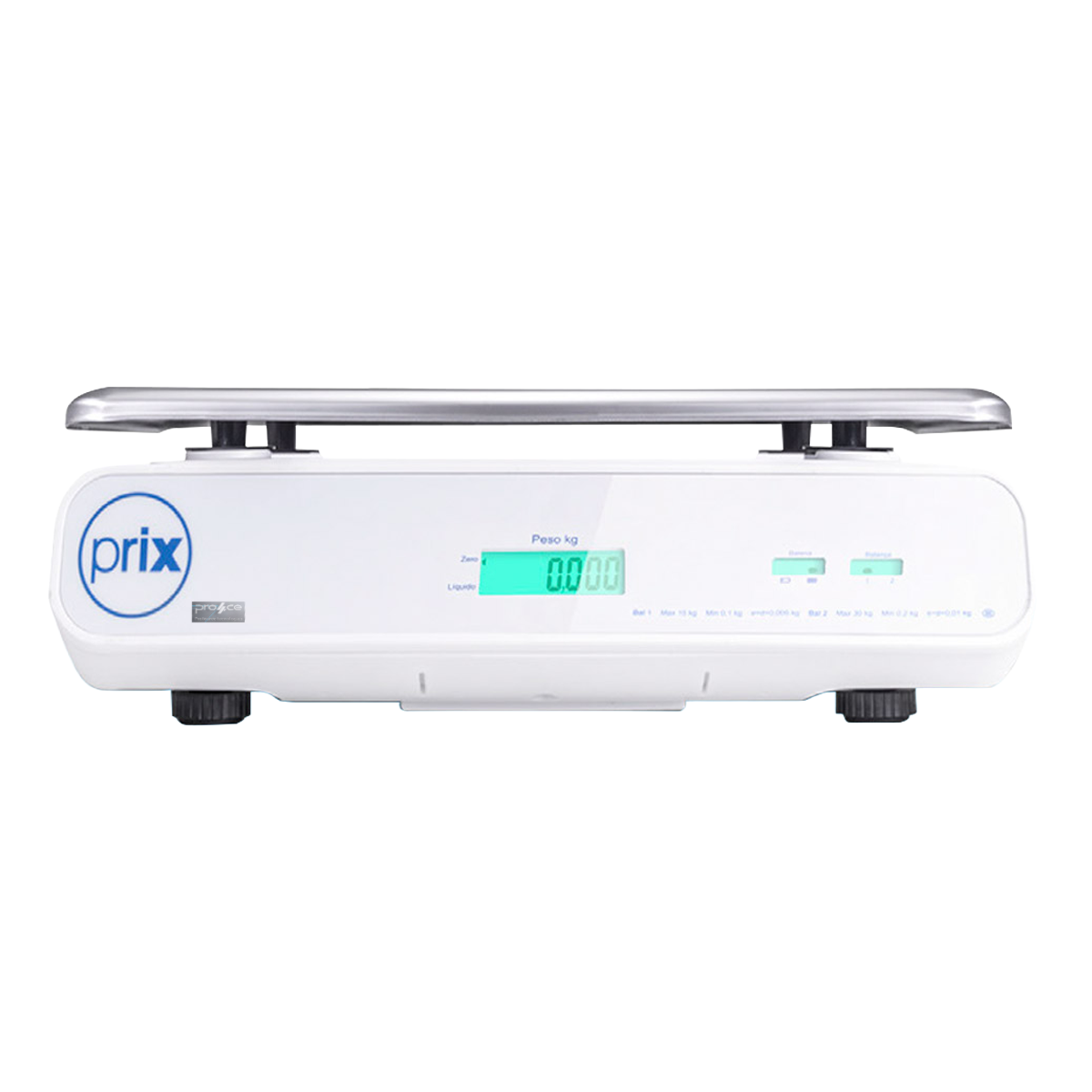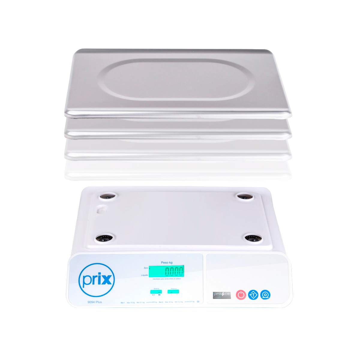 - Prato de Pesagem: Em aço inoxidável e com centro rebaixado, para evitar o escoamento de líquidos sobre os displays;