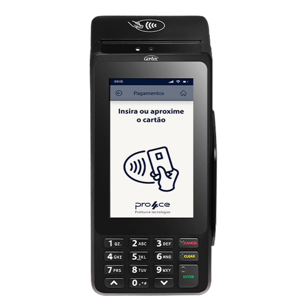 - Teclado: 10 teclas numéricas; 3 teclas padrão EMV; 2 teclas de navegação; 1 botão liga/desliga